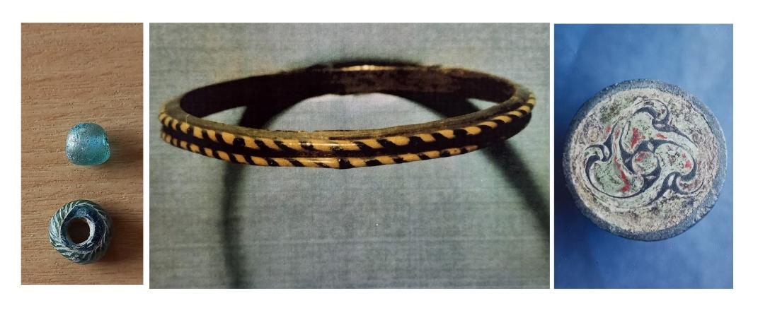Glass beads, bangles, decorated glass studs, glass vessel fragments and millefiori are typical finds on habitation sites in the early medieval period in Ireland. Most bead-types appear to have been manufactured by Irish glassworkers during this time but beads were also traded from the east Mediterranean along with Anglo-Saxon and Viking types.